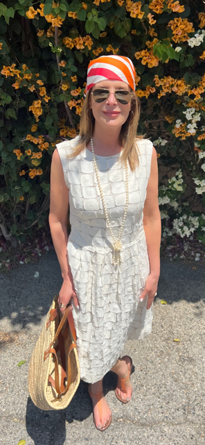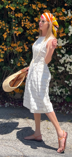 To make this look feel more like me (because that’s always the goal), I pulled in a headscarf, The Original Vera. The stripe pattern adds another geometric element to the squares from the dress and the roundness of the pearls, so my look stays cohesive. The scarf’s hot bright colours create a distinct contrast which actually helps in settling the eye. Without the scarf, the eye would keep scanning the white dress in a desperate search for a point of contrast or a resting place. For that same reason, I went with my orange sandals, Sam Edelman. Obviously, they’re a lot more subtle than the scarf, but they do add another point of contrast. Together, both colour placement points at the top and bottom make my look feel more finished and complete.