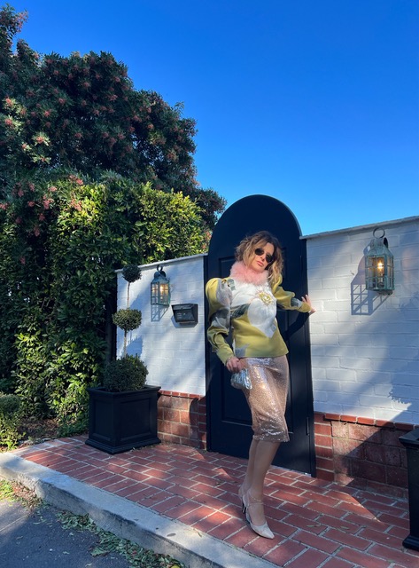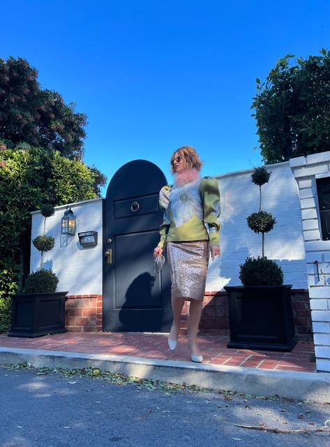 Tonight’s look is an eclectic blend of separates. Both my top and bottom have little in common but together, along with a few accessories, turned into something special and unique. I built my look around the rose gold lurex thread in the center of giant flowers on my blouse, Happy X Nature. I knew it would work with my apricot sequin skirt, Amazon, because both colours are within tonal range of each other and both are reflective so when the light hits…they match and sparkle together, perfectly. This top is all drama with a retro chartreuse base colour and giant spaced floral print on a reflective silk shantung. The fitted body has long architectural sleeves exaggerated puff shoulders and elongated fitted cuffs with tiny covered buttons. It’s a total statement piece.