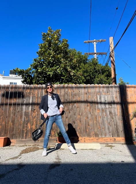 If you haven’t seen Maestro catch it now on Netflix. It stars the incomparable Bradley Cooper as Leonard Bernstein. The oh so stylish Maestro often sported a Harvard sweatshirt spelled in Hebrew that he wore with casual trousers and sneakers. This Hebrew Harvard sweatshirt, Intercut on Etsy, heads to LA’s Westside for a stylish update. Like the Jets, who wore low skinny cuffed jeans and sneakers, I’m wearing these low-rise, AG Jeans, with my old-school, Chucks – Converse. I wanted this casual look to feel youthful playful and most important pulled together so I brought in this little black shrunken blazer, Gap.