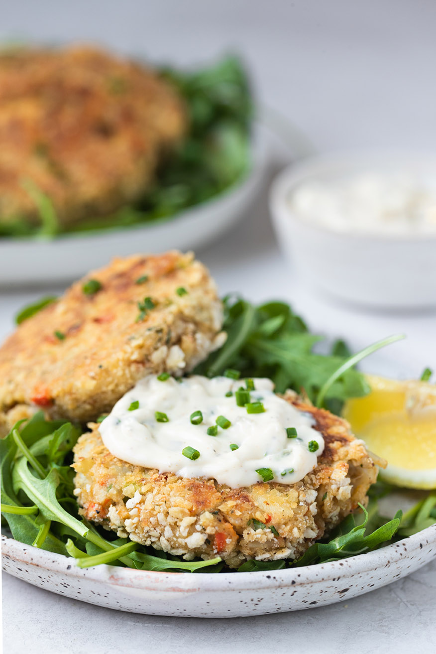 | 30 saltine crackers, pulsed into crumbs, divided (20 saltines go into the crab cake mixture, 10 for rolling) | |