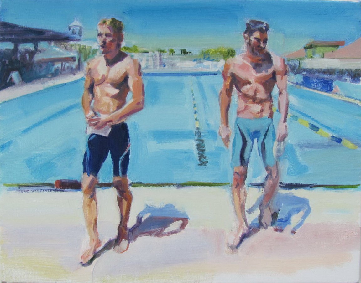 As summer ends, we get to extend the sensations of hot sun on skin, blazing reflections on water and the accompanying heat and indolence a little longer, thanks to this exhibit of small, intimate paintings by McWillie Chambers. Sensuous and dreamy, the pool, ocean, and sky colors of cobalt blue and cerulean are a background for the myriad hues of male flesh.