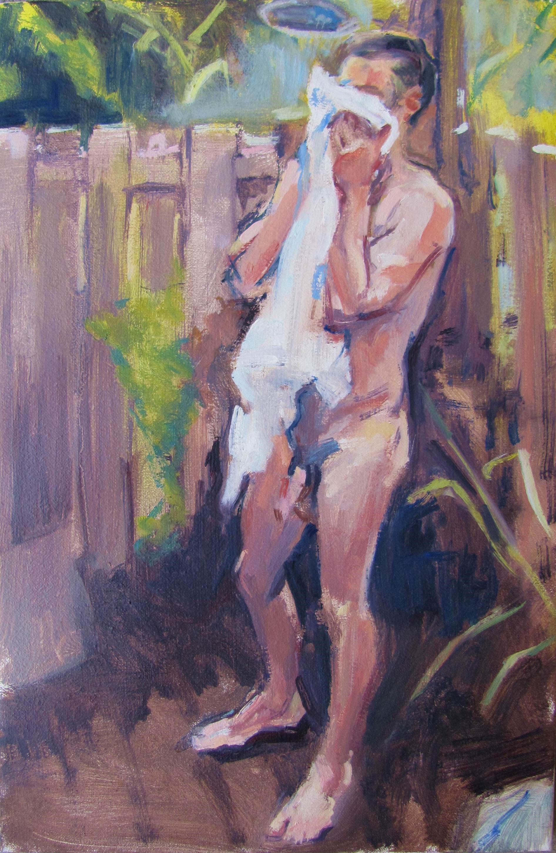 Chambers often focuses on more discerningly voyeuristic moments. “Outdoor Shower” is a study in browns and pinks highlighted with vivid areas of bright greens and dark blues. The white of the towel is seen at first glance, then the patterns of vertical shapes that become both the man and the surrounding slats of the out-door shower. Diagonal strokes of yellow green, defining grasses and trees, enliven the enclosed space while the blue eclipse of the showerhead, like a misplaced halo, hovers above.
