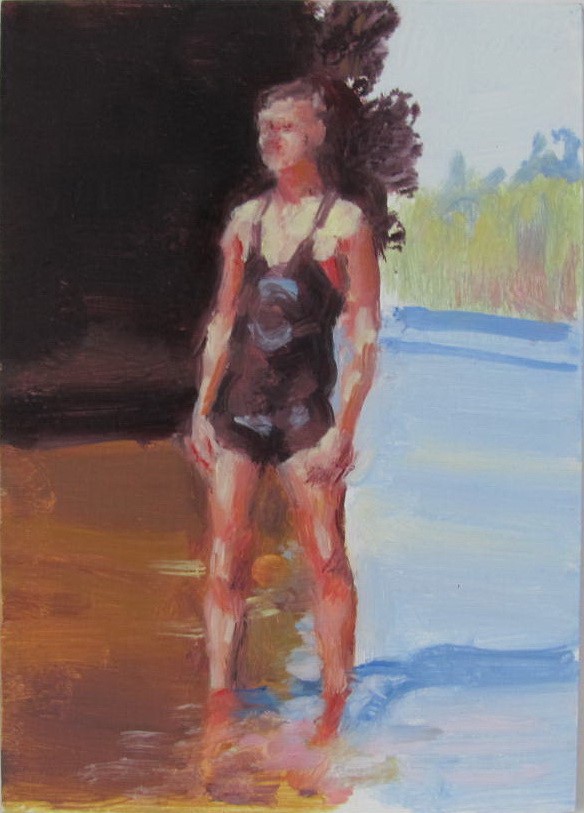 “Wading in the Lake” is divided in half by dark foliage on the left, it’s dark amber reflection in the lake, and the area still catching the light on the right. The figure is centered, his swimsuit, the same color as the trees, melds into the background. We see him solely by the light reflected on his skin. The opaque dark side is contrasted beautifully by semitransparent, pastel blue water and mint and pink vegetation on the right, that pale palette transcribing distance. A bit of this blue comes through on his swimsuit, and touches of yellow and gold dot the shadows of the water. There is an eloquent feeling of quiet and contemplation in this remarkable space of only 7 x 5 inches.
