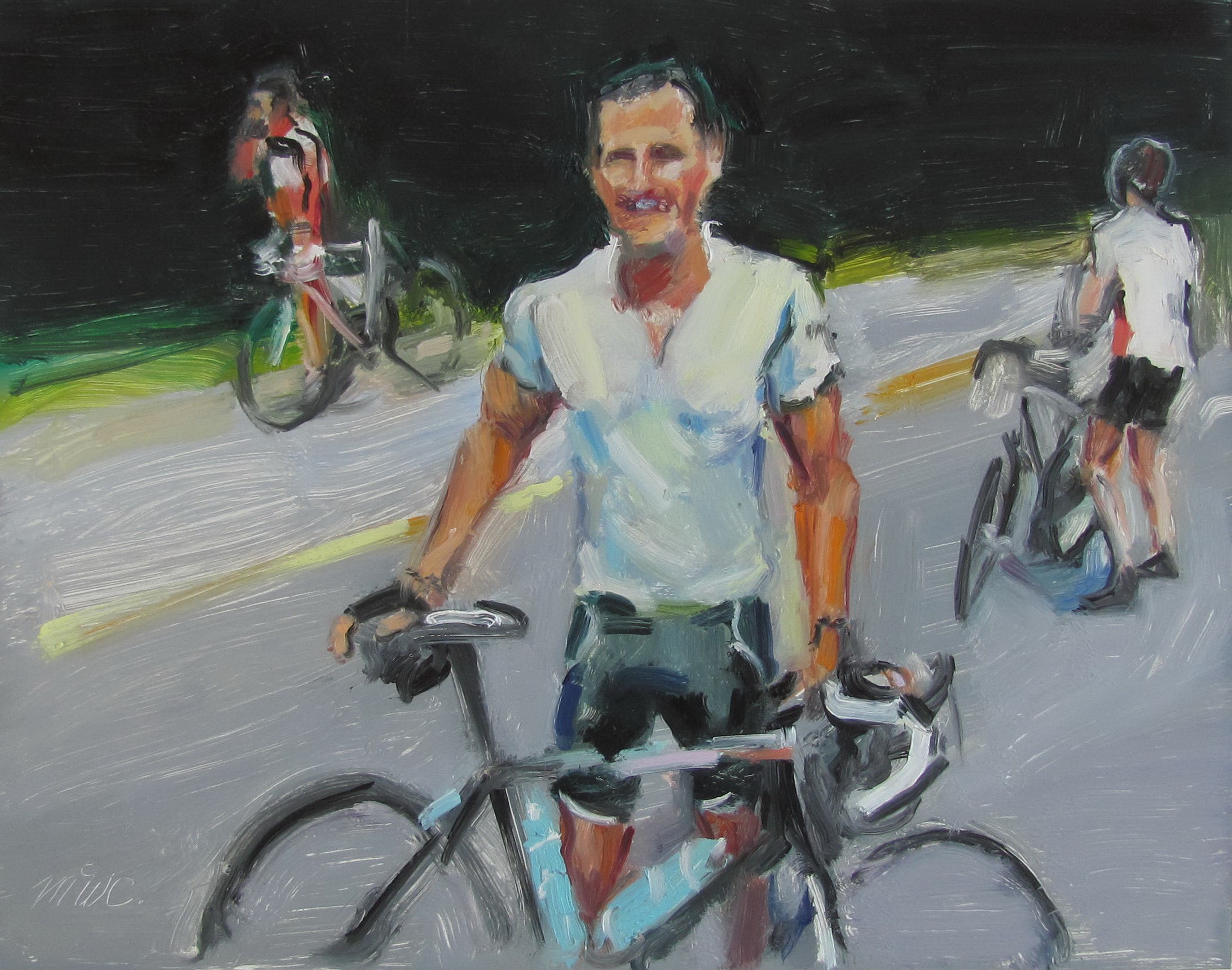 Visible strokes of grey paint, streaked with yellow, creating a forceful diagonal of road transverses “3 Cyclists.” The rich black green background sets off this trilogy of cyclists. Chamber’s compositional sophistication comes through as the full front center figure is balanced by the other two figures, one pulling towards the left and the other towards the right. The various soft grey and blue hues are set off with dabs of red, orange, and violet. The linear treatment of the bicycles in the same color as the background brings a powerful composition of high contrast.