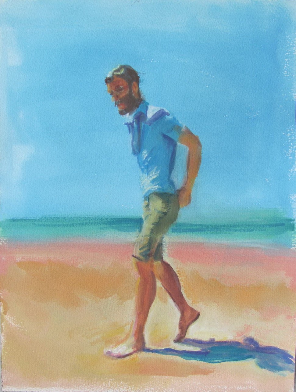 “Beach Stroll” finds another solitary figure seen in shadow against the glare of the sun. As he walks past the viewer, he seems made of the colors of the sky and sand that envelope him. A private moment, as mutable as passing clouds.