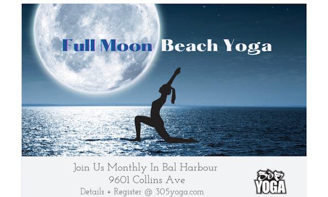 If you haven’t experienced Yoga on the beach, this is a big opportunity for you. Not only will you feel sand under your feet, but you will be looking up at the moon. I can’t think of two better forces of nature to make you feel calm and relaxed. 305 Yoga is now offering a monthly series in Bal Harbour, 9601 Collins Avenue.