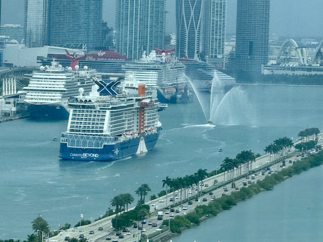 Every time a new cruise ship enters or leaves the Port of Miami, the Coast Guard creates an exciting waterfall display that celebrates its existence. Folks driving by on the MacArthur Causeway (see photo) get a real treat that you just don’t get to see very often. It’s a beautiful sight. Fortunately for me, the windows of my condo stare straight down on Port Miami, one of the busiest cruise stops in the United States. Port Miami is located in Biscayne Bay, east of downtown Miami, and consists of three connected islands.