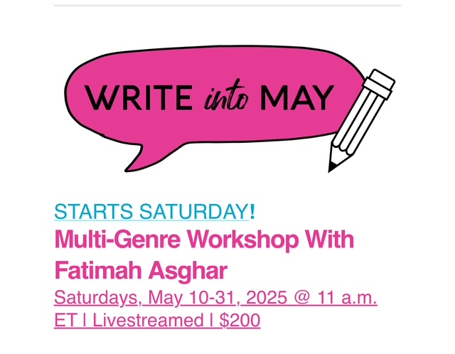 Lyricism Across Genres: A Multi-Genre Creative Writing Workshop is a 4-week virtual course with poet and writer Fatimah Asghar. Throughout these four workshops, attendees will engage in close study of poetry, film, and other forms of media, with exercises that help explore the essence of lyricism, and how it can be harnessed in service of our work in many art forms.