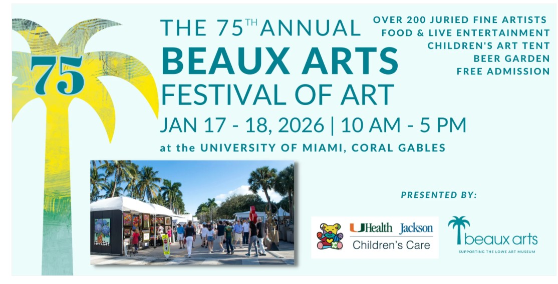 Each year, over 25,000 visitors stroll through artist booths, discover new talent, and enjoy a lively weekend filled with music, food trucks, a bustling marketplace, and hands‑on art activities for children. Entirely volunteer-run, the festival reflects the heart of the Beaux Arts mission: expanding access to the arts and supporting the Lowe Art Museum and arts education throughout Coral Gables.