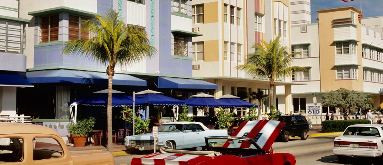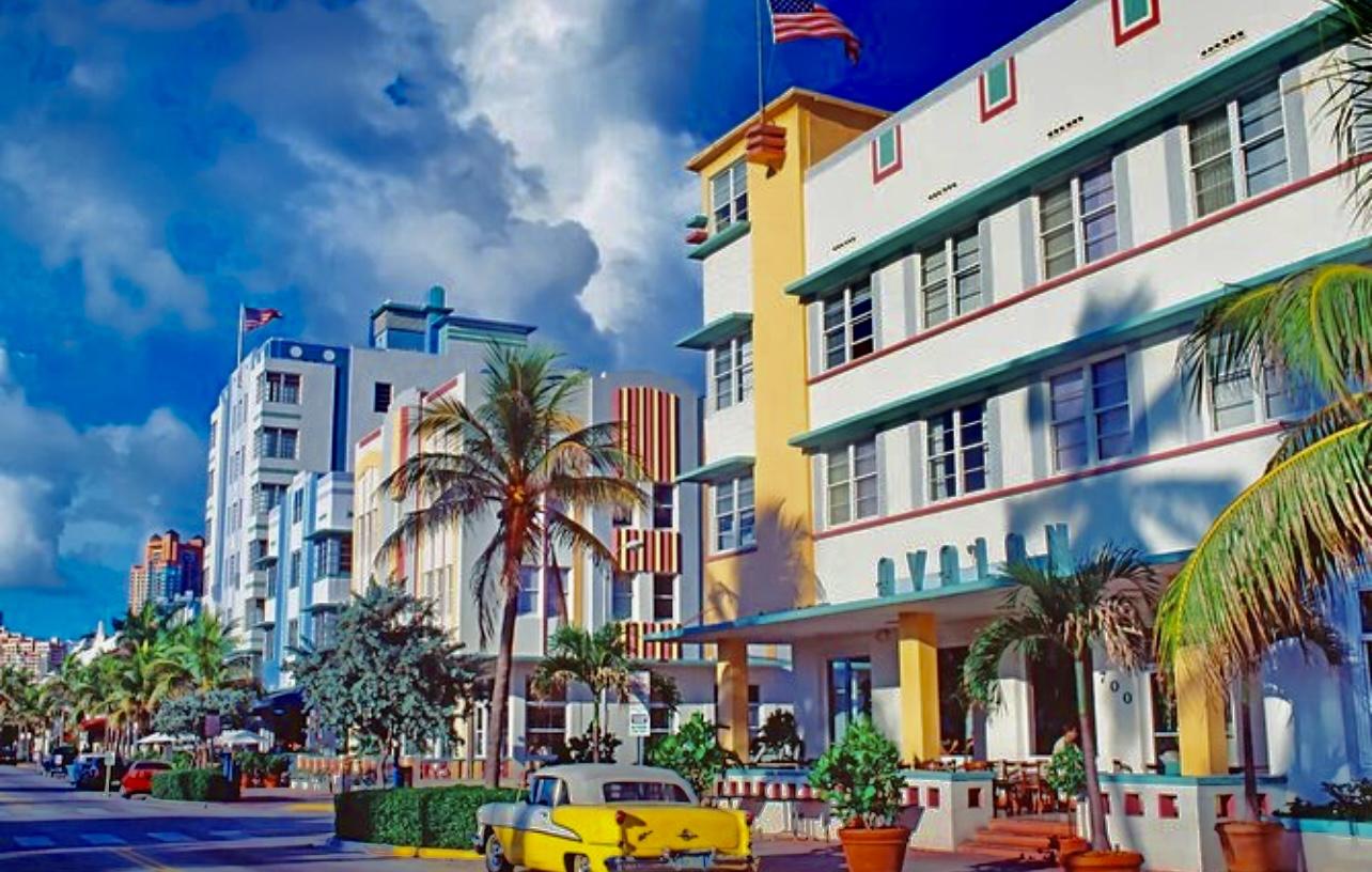 Art Deco is an artistic movement dating from the 1920s. The buildings feature geometric shapes (cubes, spheres and straight lines) and are characterized by their heavy ornamentation, being more decorative than strictly functional. They include Terrazzo floors, moulded ceilings, tropical and pastel colors, straight lines, relief moulding and, above all, neon lighting are some of the most famous characteristics of Miami’s Art Deco style.