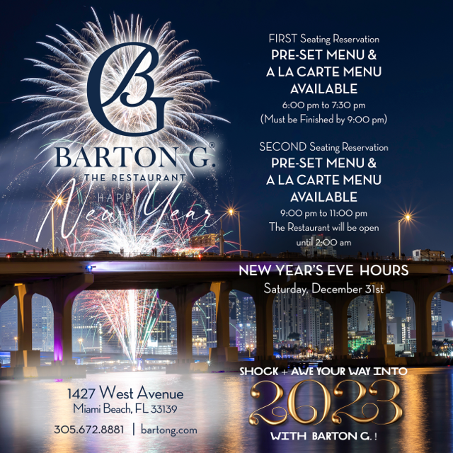 If you want to spice up New Year’s Eve, or any holiday during 2023, you must dine at Barton G in Miami. The food is great, but the rotating table decorations are something that will make you feel super special.