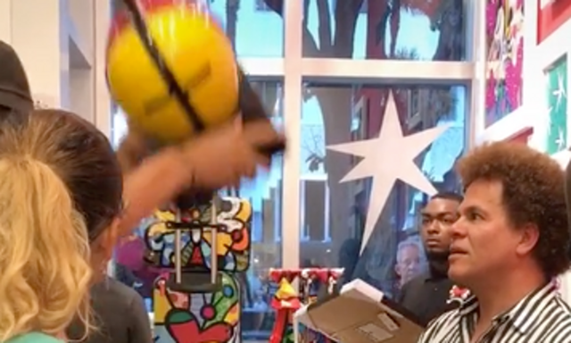 Apparently, she was a former Britto customer because she entered the store with her own Big Apple porcelain piece reportedly worth $4,800. She walked right up to the Brazilian artist, screamed at him for a solid minute, then smashed the art piece on the floor to show her fury. Britto wasn’t fast enough when he tried to catch the item. Watch the video. The reaction on Britto’s face is complete shock and the look of innocence. He had no idea what the woman was talking about.