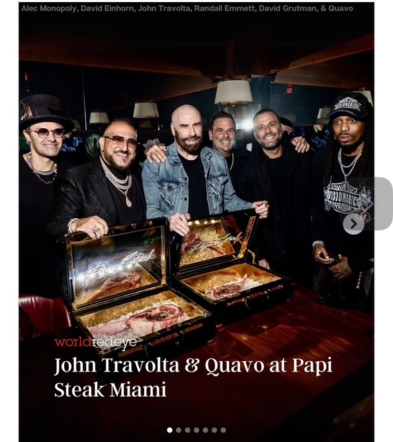 Local newspapers reported that Travolta enjoyed the presentation especially because it was inspired by the legendary briefcase scene in “Pulp Fiction.” He got to live that moment all over again. He was in all of his glory when he posed for photos with Papi Steak co-owners David “Papi” Einhorn and David Grutman as well as artist Alec Monopoly, film director Randall Emmett, and rapper Quavo.