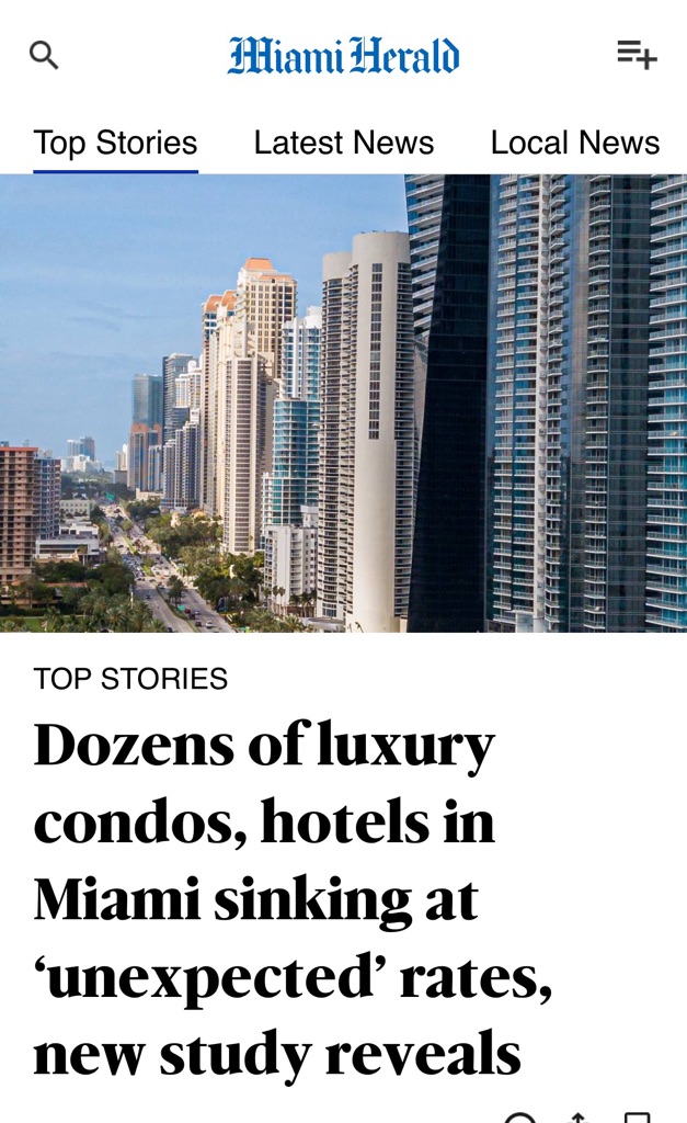 My cell phone was constantly ringing the last few days from family and friends from the north asking me if we had any plans to move because they heard about an article in the Miami Herald saying tall condo buildings and hotels are sinking into the ground. The University of Miami reported that dozens of luxury beachfront condos and hotels in Surfside, Bal Harbour, Miami Beach, and Sunny Isles are sinking into the ground at rates that were “unexpected,” with nearly 70 percent of the buildings in northern and central Sunny Isles affected. The study identified a total of 35 buildings that have sunk by as much as three inches between 2016 and 2023, including the iconic Surf Club Towers and Faena Hotel, the Porsche Design Tower, The Ritz-Carlton Residences, Trump Tower III and Trump International Beach Resorts. Together, the high rises accommodate tens of thousands of residents and tourists. Some have more than 300 units, including penthouses that cost millions of dollars.