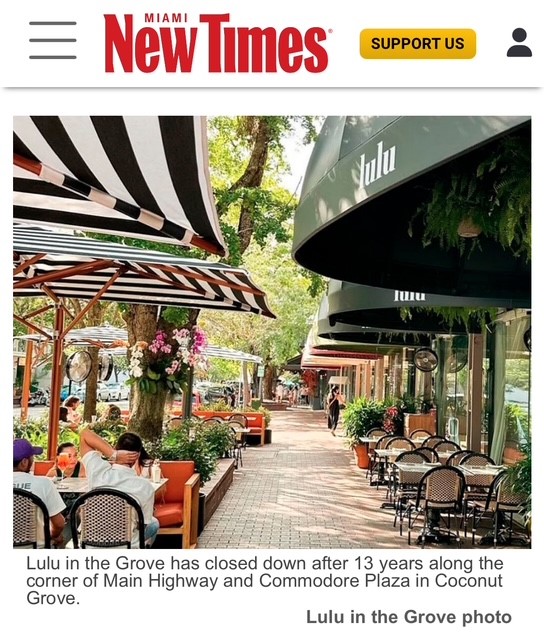 The newspapers also reminded us, “At one point between 2011 and 2017, before the recent renaissance of the Coconut Grove we know today, Lulu and Greenstreet Cafe were two of the only solid spots in the area, and both seemed to keep the stagnant CocoWalk area afloat, which for years was only notable for its movie theater and Starbucks shop. For those who attended school nearby at Carrollton School of the Sacred Heart or Ransom Everglades Upper School, Lulu was the go-to spot for skipping class (sorry, parents) or for an afterschool snack.”