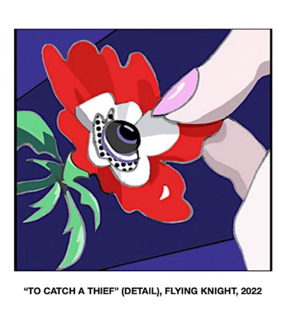 As part of her ongoing “Painting in the Stars” series; in these playful paintings, Flying Knight explores global warming through the narrative of a prospective astro journey into a world solely inhabited by lighthearted plants until mankind arrives and destruction begins.