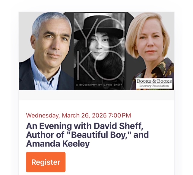 This is how Books & Books spells it out. “This book was nearly a half-century in the making. In 1980, David Sheff met Yoko and John when Sheff conducted an in-depth interview with them just months before John’s murder. In the aftermath of the killing, he and Yoko became close as she rebuilt her life, survived threats and betrayals, and went on to create groundbreaking art and music while campaigning for peace and other causes.”