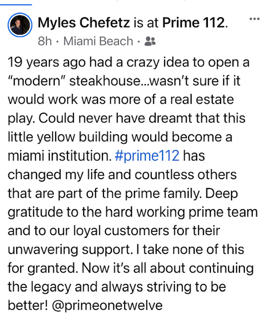 One of the most successful restaurants in Miami just celebrated its 19th birthday. The much admired restaurateur, Myles Chefetz, owner and founder of Prime 112, just posted his good fortune on Facebook. The Three Tomatoes wants to personality congratulate Myles for his professionalism, graciousness and making sure all of his customers are given so much food for the money they spend. The on-the-house appetizers can fill you up so be careful to pace yourself before the entree.