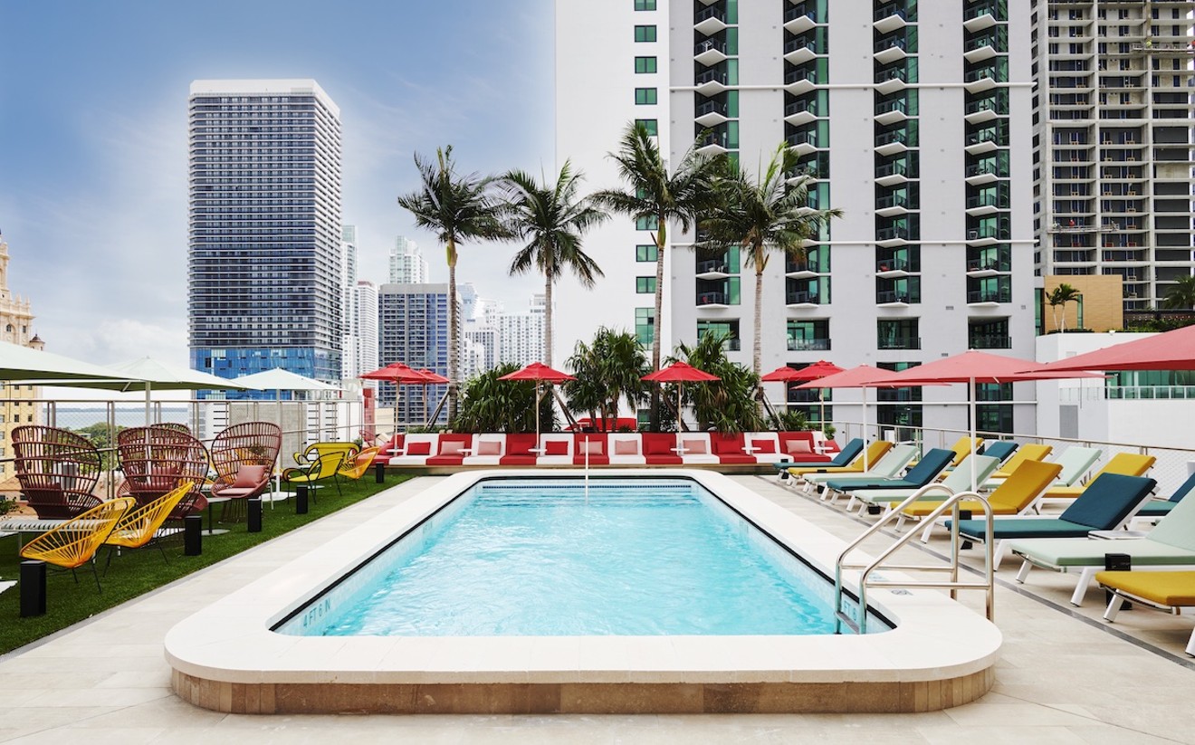 The rooftop pool and bar are located at the CitizenM hotel at the Miami Worldcenter. The promotional materials promise panoramic vistas of the Miami skyline and Biscayne Bay greeting you wherever are on the rooftop. The open-air setting feels as though it was made to be the city’s hottest new outdoor destination (alongside the WorldCenter’s relaunch of Juvia.)