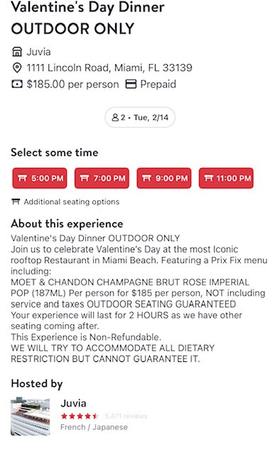 There is no doubt that every restaurant lost a lot of money during the pandemic, and they need to make it up as fast as possible. The only trouble is that many of the new restaurant protocols have forced many of us to lose our taste for expensive meals that have a time limit. Just look at what Juvia, one of the most popular roof top restaurants on Lincoln Road, posted in a Facebook advertisement. Their romantic dinners are priced at $185 per person for a two-hour experience.