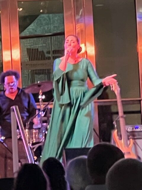 We went to a concert in the courtyard last Thursday night with our friends Ruth and Howard Greenberg, Steve Greenberg, and Robert Armada. We listened to the sounds of Leslie Cartaya. She is a singer songwriter and Grammy nominee. It was 75 glorious degrees outside. We felt so lucky to finally find a concert with people our own age enjoying a night out.