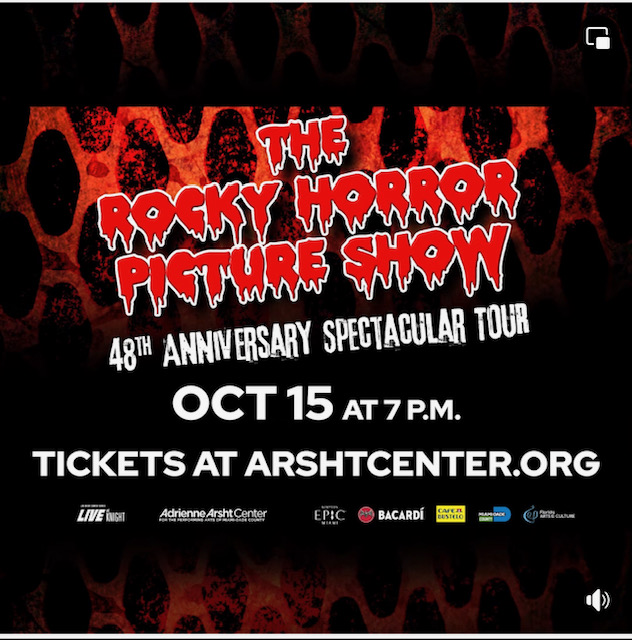 The original Rocky Horror picture show is coming to Miami at the Adrienne Arsht Center. Tickets are $35. Let me know soon if you want to go in a group. I will organize one. It can be three of us to as many as we get. It will be fun to go with people you know. This is one of the best chances to see a slightly older group than you usually get at Miami events. Trust me, plenty of young people are going to show up, but this is our chance to out sing them.