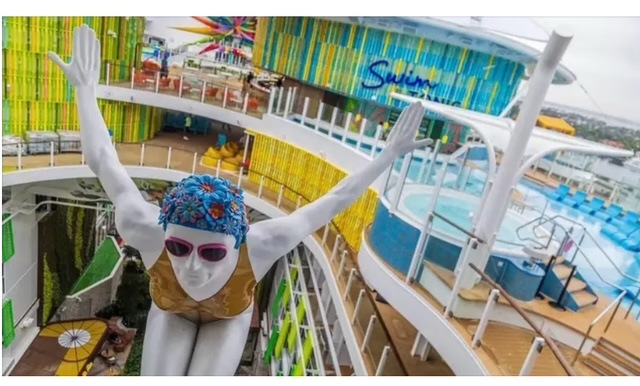 A sculpture of a swimmer hangs above an internal courtyard – known as “Central Park” on the ship