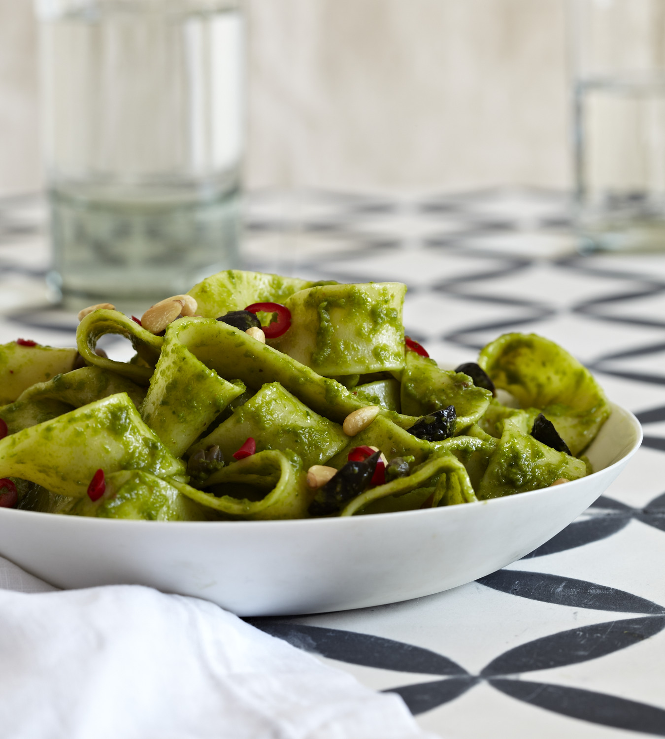 Here it’s tossed with pappardelle, fabulous wide, long noodles, whose name comes from the Italian word pappare, “to gobble up,” but its fabulous with any pasta.