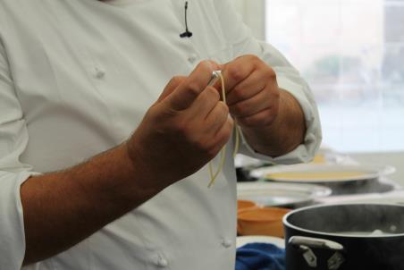 -3- Then pinch both types of pasta between your thumb and index finger. The inferior pasta will be gummy to the touch and soft in the middle, while the better pasta stays al dente.