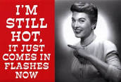 I think hot flashes and Tampax are oddly similar. They come in light, medium and heavy. You may experience a hot flush of warmth spreading through your upper body and face, or your face can appear red & blotchy. In the case of many shmirshkies, you can suddenly find yourself in bed at night, dripping wet, ripping off your jammies and staring at a pile of soaking wet sheets and your heart racing. Sleepless and anxiety-ridden, you may be gazing across your bed, trying to find your partner who is bundled up with extra blankets struggling to handle your thermostat selection of 65 degrees.