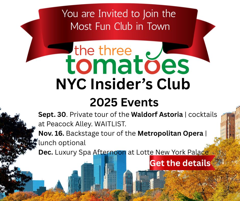 Our NYC Insider’s Club is off to a great start. Our first event, a private tour of the Waldorf and cocktails at Peacock Alley, is fully booked. Next up: Backstage tour of the Metropolitan Opera House ($25) and a Luxury Spa Afternoon at Lotte New York Palace, including mini treatments like Red Light Therapy, Hyperbaric Oxygen, PEMF, and world-class massage. Plus, a special presentation by Immunocologies Karen Ballou on facial yoga and Blue Zone-inspired skincare rituals. Lite bites and refreshments—FREE to members. GET THE DETAILS.
