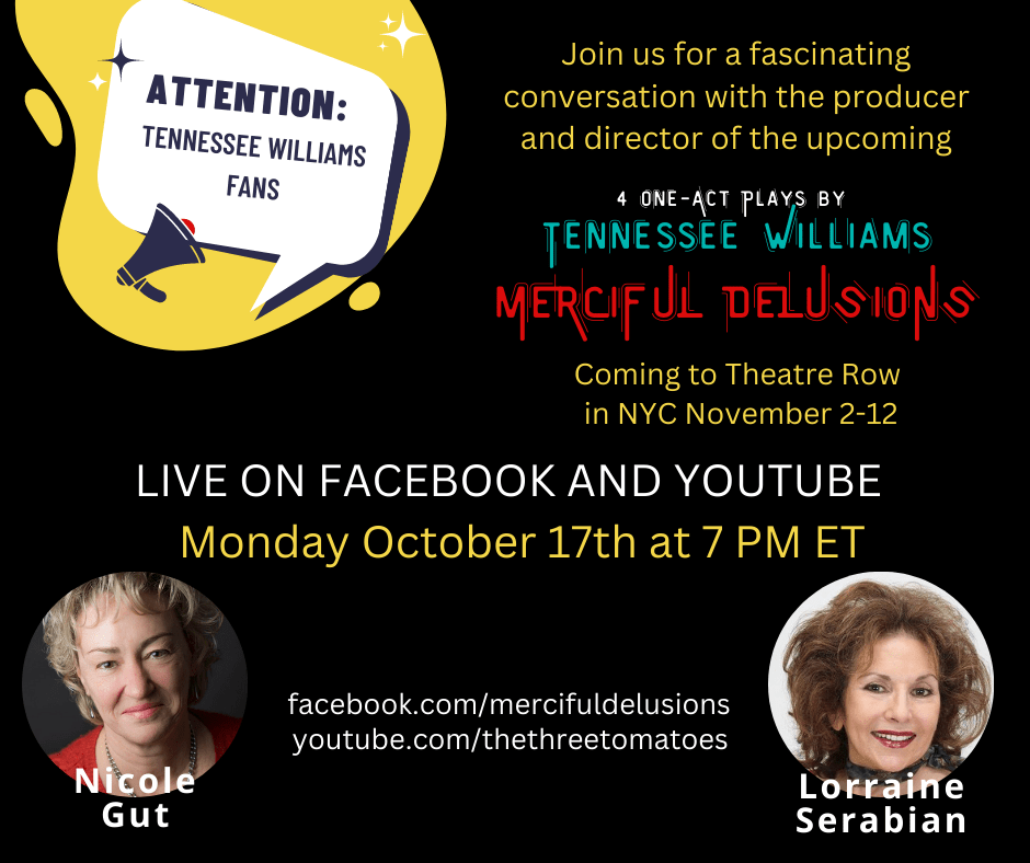 Everyone’s talking about Merciful Delusions: Four one-act plays by Tennessee Williams. I am so excited to be interviewing the show’s producer, Nicole Gut, and Tony nominated director, Lorraine Serabian LIVE ON FACEBOOK. This exciting production of his rarely produced plays comes to the Off-Broadway stage in in Times Square at Theatre Row from November 2nd to 12th, 2022. Delusions of grandeur is a common theme in the four plays and reveals a fascinating perspective to one of the world’s most important playwrights. Go to https://facebook.com/mercifuldelusions or https://facebook.com/thethreetomatoes .