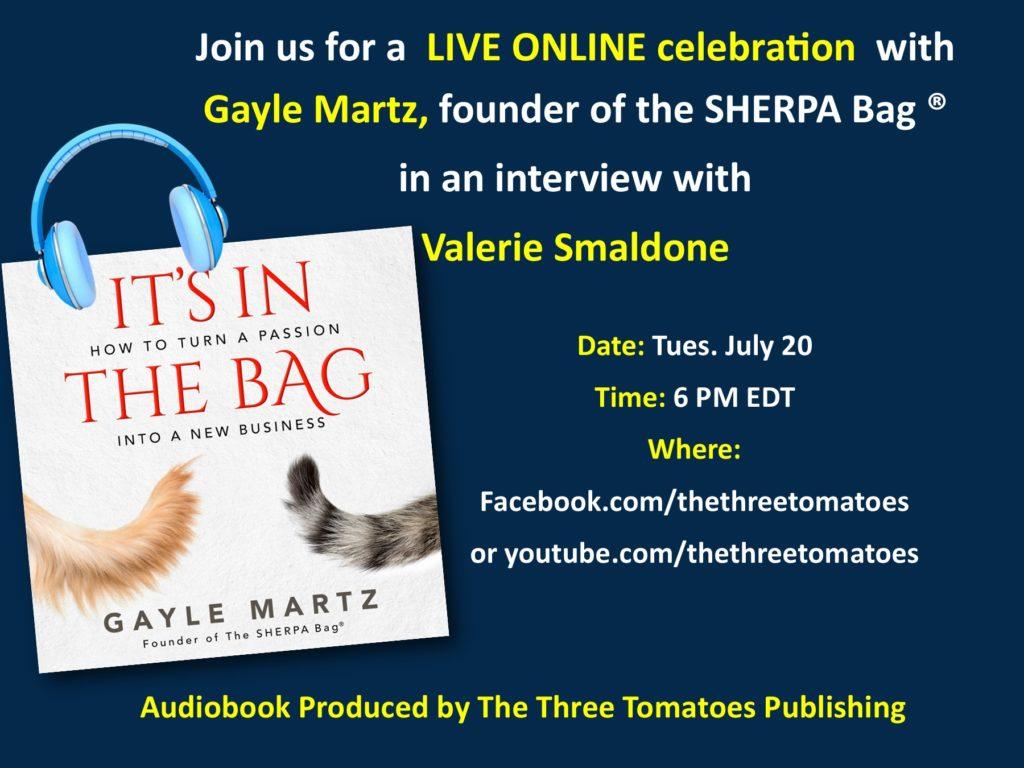 We’re excited to celebrate the audiobook version of Gayle Martz’s wonderful memoir, It’s in the Bag, that tells the story of how she founded SHERPA Bag and changed traveling with pets forever. Media personality Valerie Smaldone, who heads the audiobook group of The Three Tomatoes publishing, narrated the book and she will be interviewing Gayle. Just go to Facebook or YouTube at 6 PM ET on July 20.