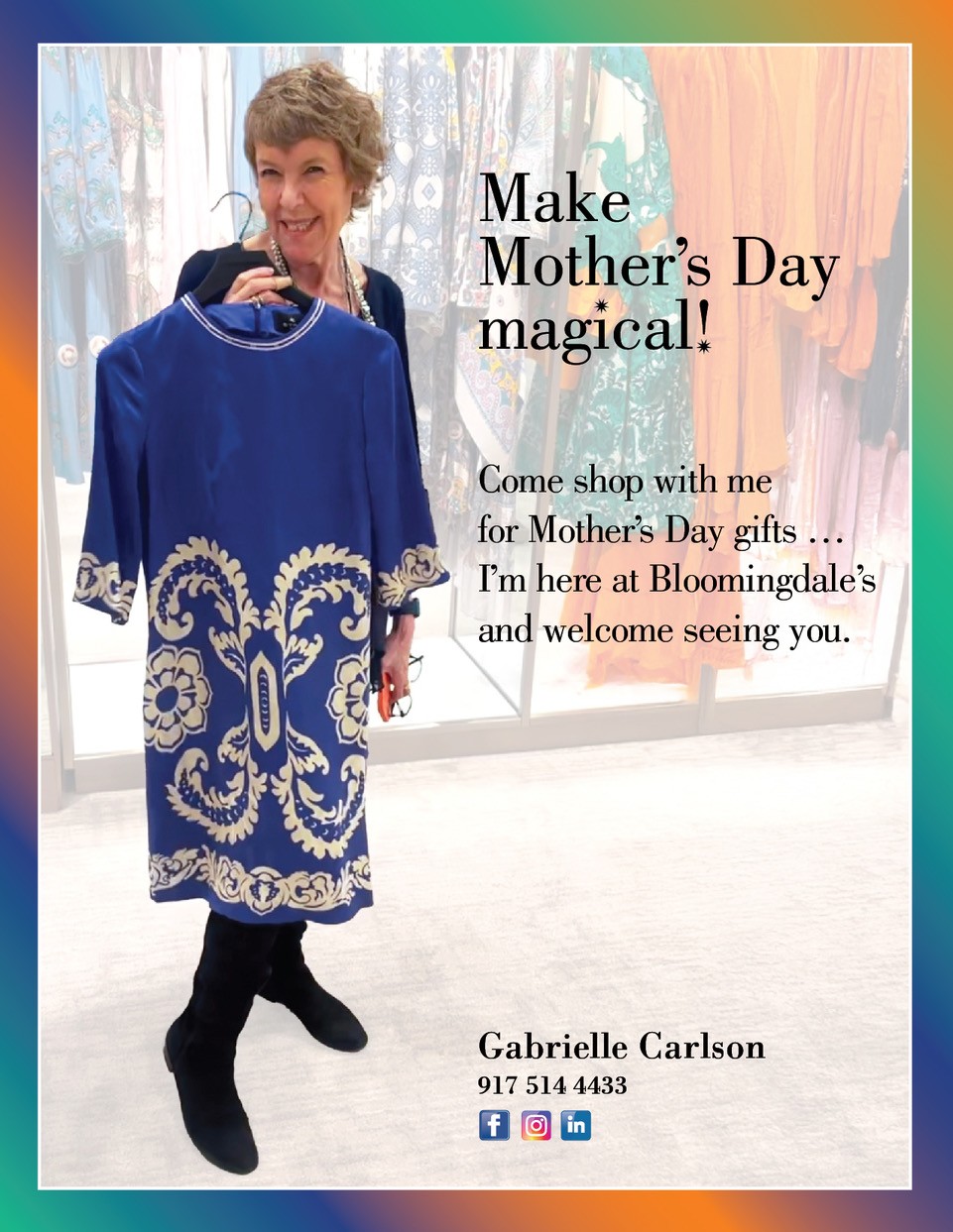 We know from our recent shopping survey that many of you find department store shopping overwhelming. Well, not anymore. Our dear friend Gabrielle Carlson, who is an expert in dressing women of all ages, shapes, and sizes, will make shopping a fun experience. Call her to set up a meeting date at Bloomingdale’s or just ask for her on the third floor.