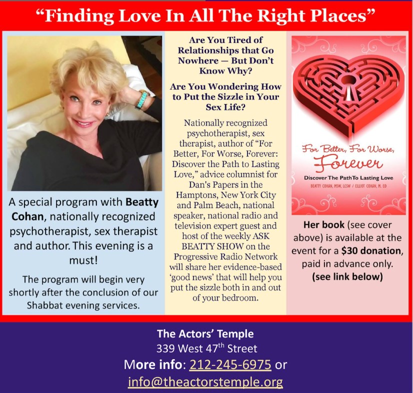 Head to the Actors’ Temple for a special program with Beatty Cohan, one of our long-time 3T contributors. She is a nationally recognized psychotherapist, sex therapist and author of “For Better, For Worse, Forever.” This evening is a must! Her book will be available at the event for a $30 donation. The event starts at 8PM. The Actors Temple 339 W. 47th Street, NYC. Get the details at:info@theactorstemple.org or 212 245 6975