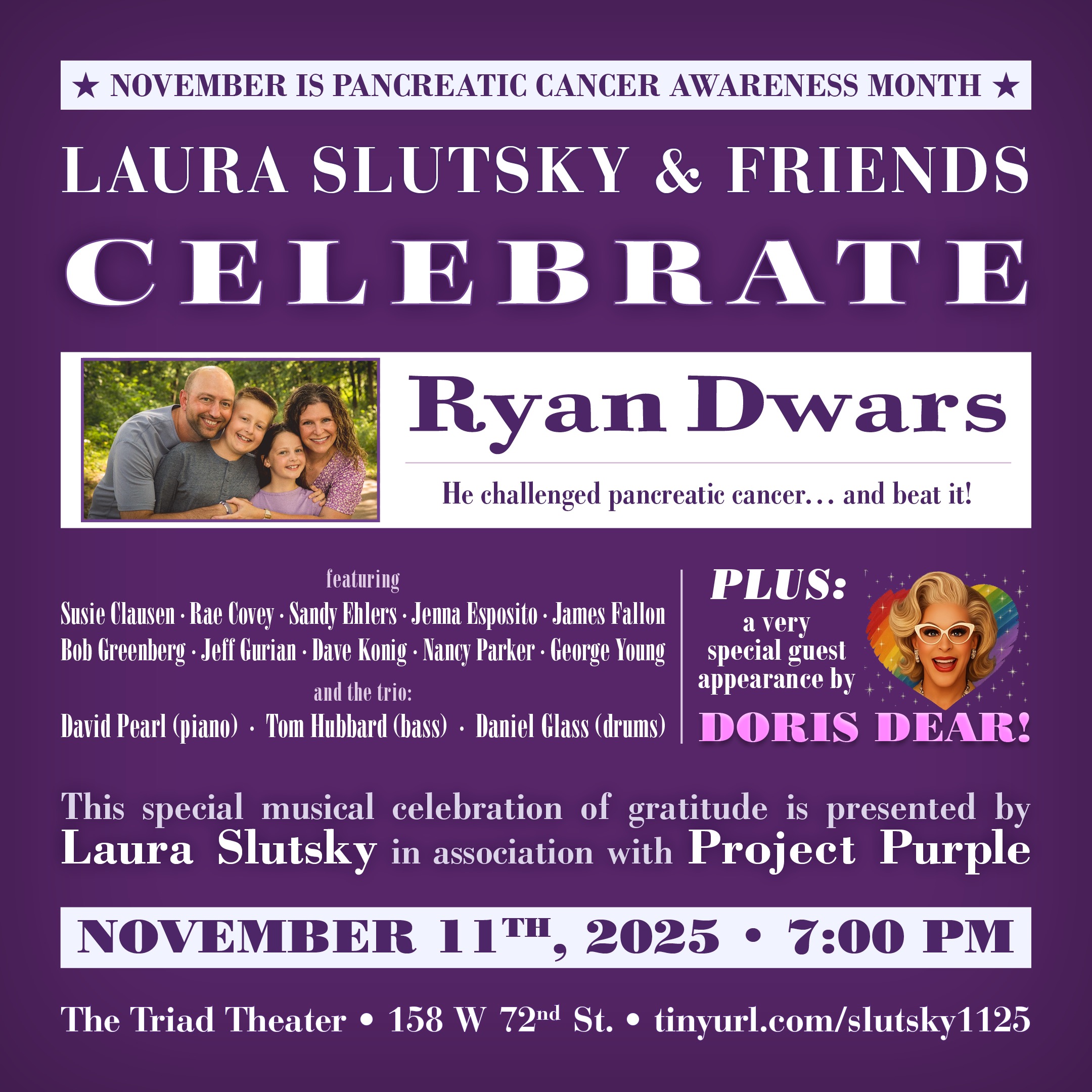 Join Laura Slutsky and her sensational lineup of singers and comics for a one-night-only celebration of courage, care, and community. In honor of Pancreatic Cancer Awareness Month, this heartfelt event pays tribute to caregivers and one extraordinary warrior: Ryan Dwars, who bravely beat pancreatic cancer. Ryan and his wife Brooke, will be honored as our very special guests. It will be an uplifting blend of comedy, live music, and moving tributes — all in celebration of courage, care, and community. 🕕 Doors open: 6:15 PM 🎭 Show starts: 7:00 PM ⏱️ Get tickets here.