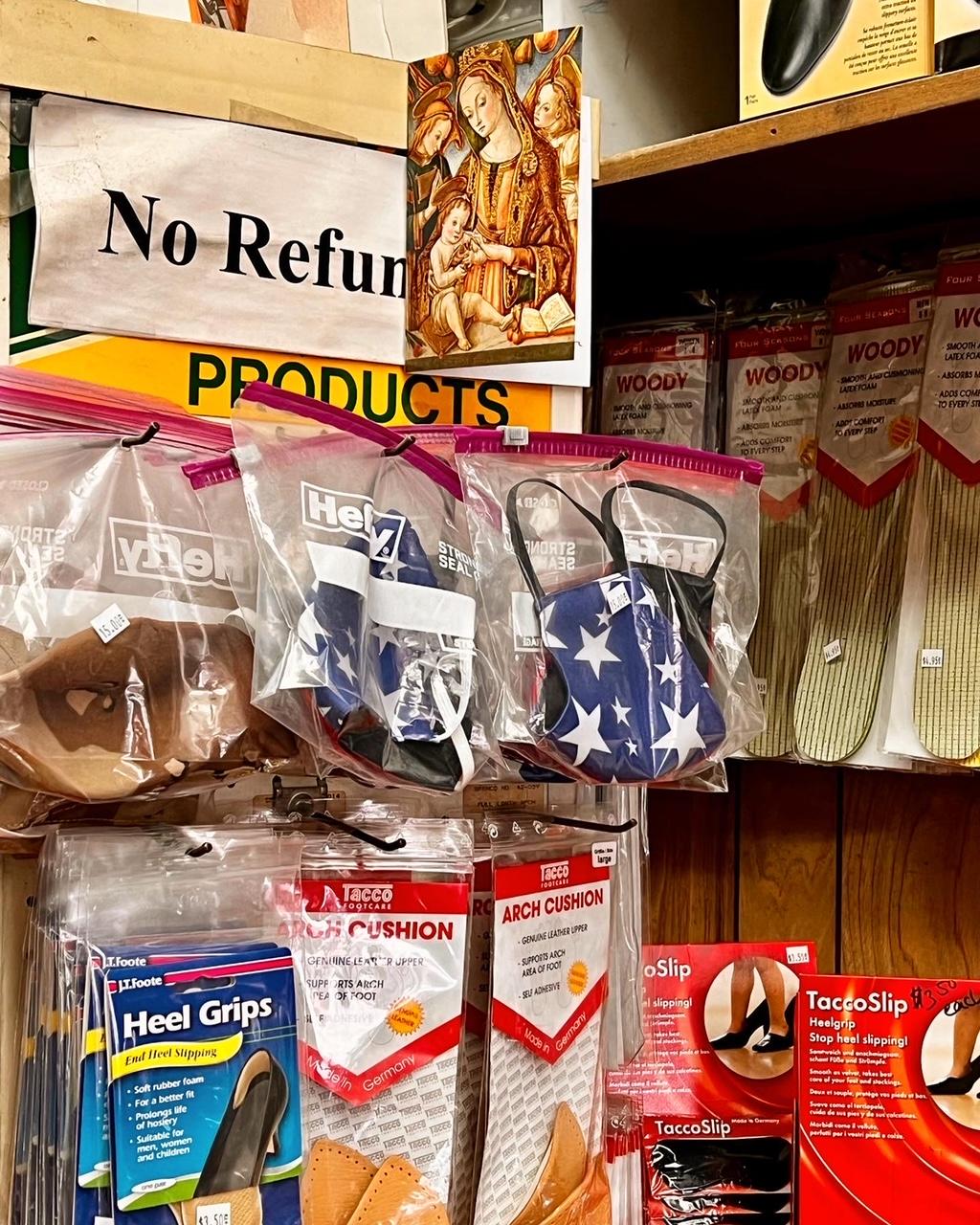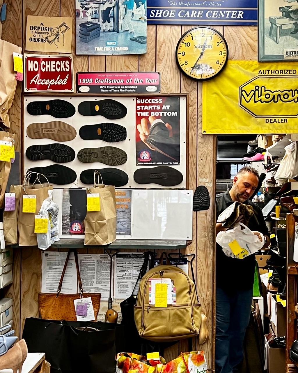 “I do adore all of New York City’s mom and pop shops and the abundance of shoemakers really brings me back. There are not many interesting statistics I can offer, but I can describe the sights, sounds and smells I experienced walking into Pavlov’s Repair. The long narrow shop in a brownstone on a side street in Carnegie Hill has not changed much since it opened its doors in 1974. One is greeted by vintage neon signage and an old school wall clock. The visual stimulation of hundreds of colorful shoe care items lining shelves from floor to ceiling is a tad frenetic, energizing the small store.