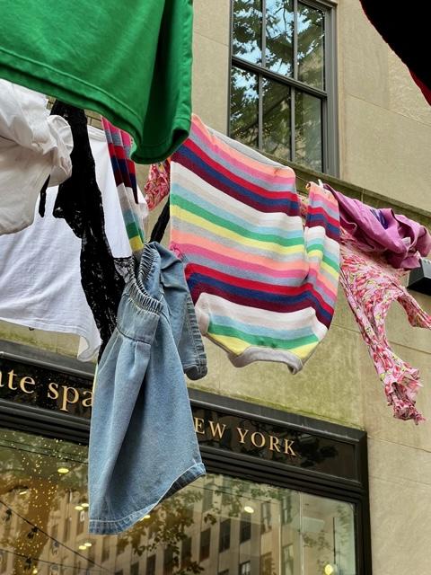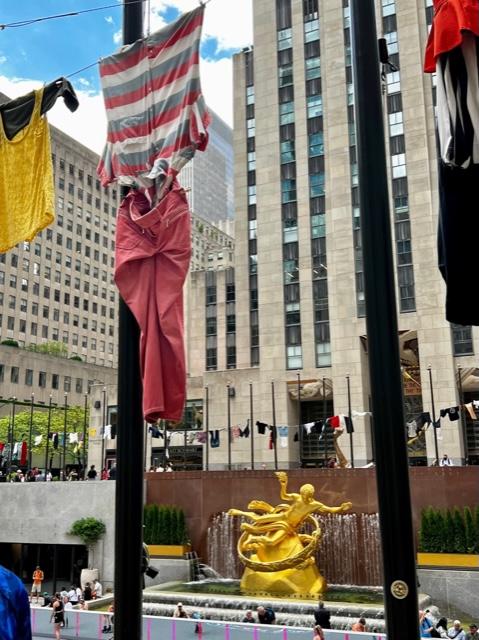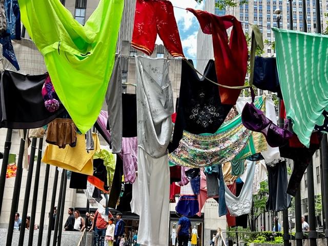 Our roving photographer, Nicole Freezer Rubens has captured some fabulous photos of an exhibition created by MASA Galeria of Mexico City that is spread throughout NYC’s Rockefeller Center. Outside on the main plaza surrounding the famous skating rink is an impactful new work of art by Pia Camil. It is titled Saca Tus Trapos Al Sol, Air Your Dirty Laundry. This is her most massive public work to date.