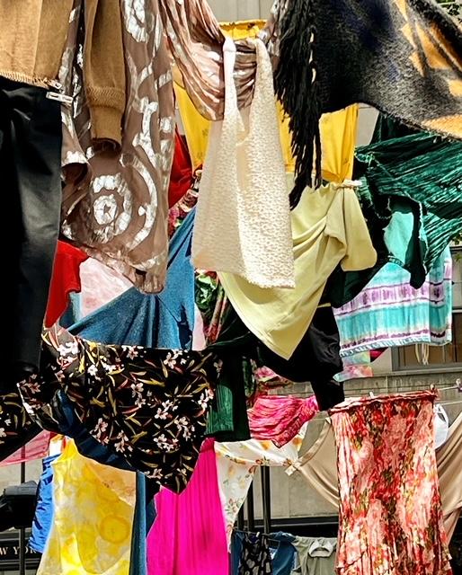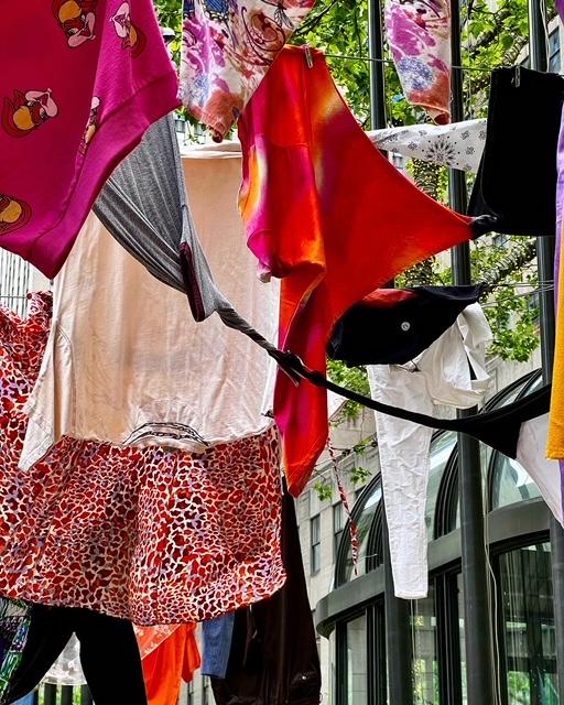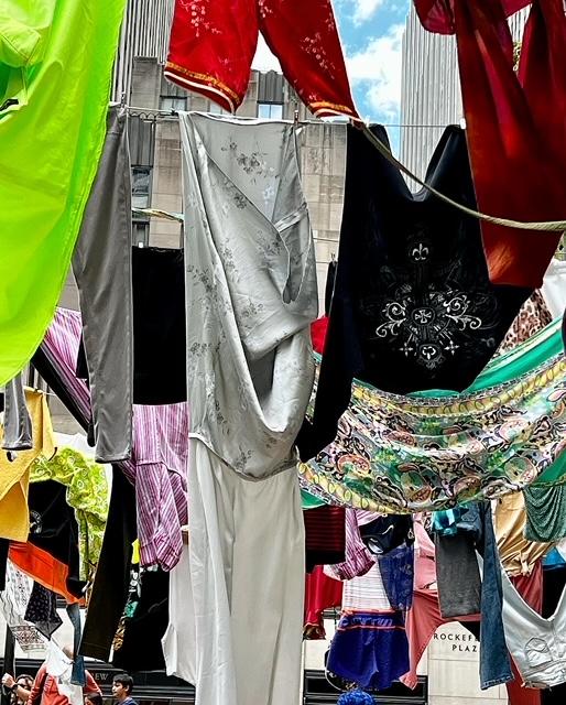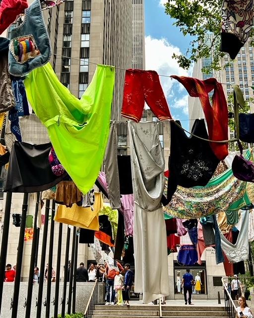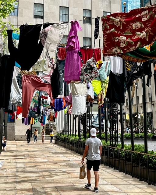 The sheer volume of clothing installed on laundry lines replacing the usual 193 flags that are a staple at Rockefeller Center, span a full array of colors and styles that blow in the breeze and change color with the sun. Laundry drying in the open air is a shared universal sight all over the world. The garments are used clothing exchanged by the citizens of Mexico City. Camil recorded stories by the people about their personal memories attached to their clothing evoking individual stories and emotions also universal to us all. The artist says the items “contain our sweat and secrets; they bear witness to our moments of joy and sadness”. We all have dirty laundry to air and share. Nicole is the author of The Long Pause and the Short Breath. Follow her on Instagram@nfrconsult.