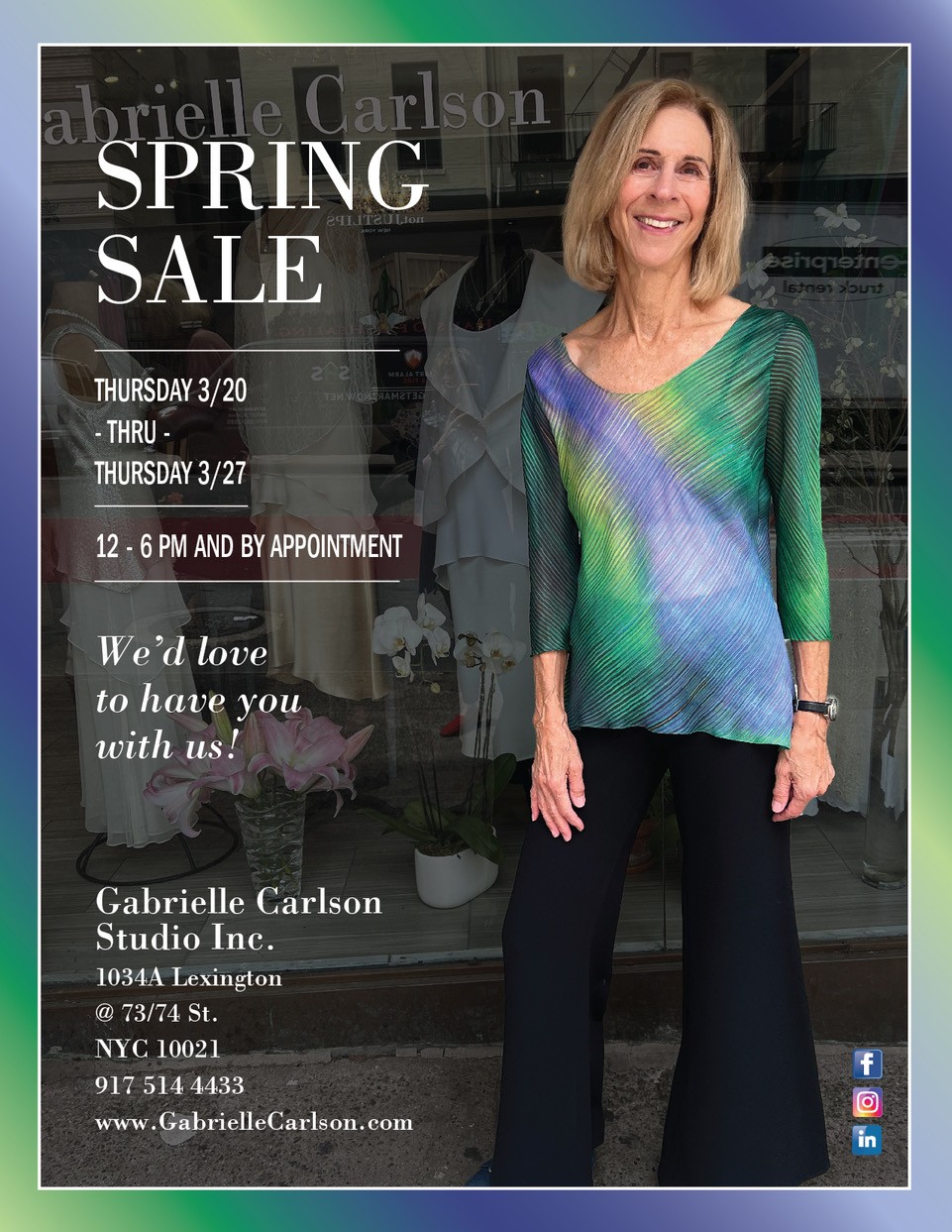 Many of you know that our dear Gabrielle Carlson is closing her Lexington Avenue store at the end of the month, so hurry in for an amazing spring sale. Gab is starting a new chapter in early April when she joins Bloomingdale’s in a specially created position. This new role allows her to continue dressing you in a wider array of pieces from designers whose clothing will perfectly complement your existing Gab wardrobe. Head to the spring sale at 1034A Lexington @73/74 St.