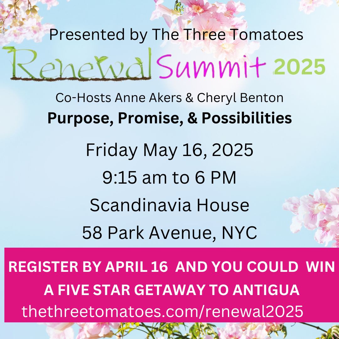Cheryl Benton, aka the “head tomato” is founder and publisher of The Three Tomatoes, a digital lifestyle magazine for “women who aren’t kids”. Having lived and worked for many years in New York City, the land of size zero twenty-somethings, she was truly starting to feel like an invisible woman. She created The Three Tomatoes just for the fun of it as the antidote for invisibility and sent it to 60 friends. Today she has thousands of friends and is chief cheerleader for smart, savvy women who want to live their lives fully at every age and every stage. She is the author of the novel, "Can You See Us Now?" and co-author of a humorous books of quips, "Martini Wisdom." Because she's lived a long time, her full bio won't fit here. If you want the "blah, blah, blah", read more. www.thethreetomatoes.com/about-the-head-tomato