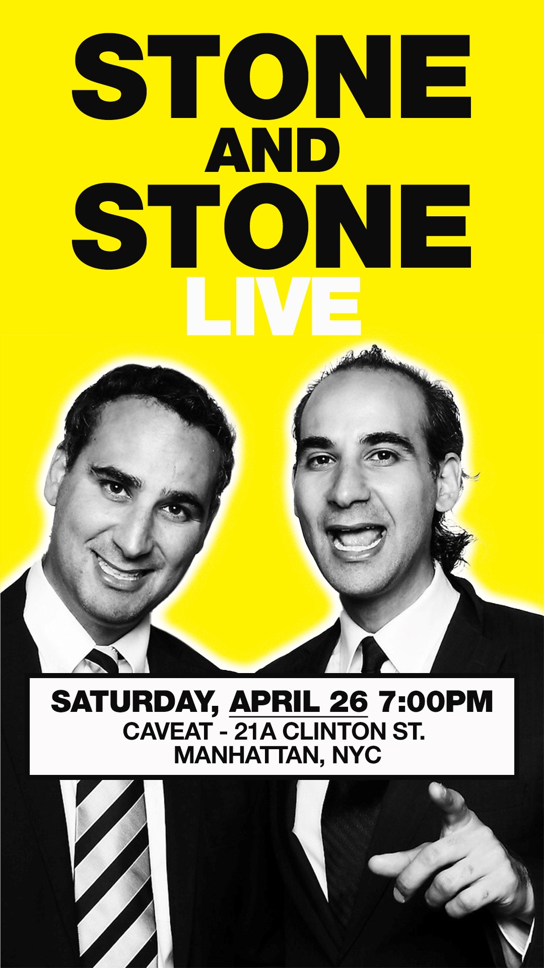 Stone and Stone (Comedy Central, NBC’s “Last Comic Standing”) are the figurative love children of Richard Lewis and Jennifer Coolidge. And they’re back! This time, on Saturday, April 26th at a hip new comedy venue, Caveat, on the Lower East Side. No minimum spend and just steps away from fantastic places to eat. Laugh a lot, nosh a little. Or a lot! It’ll be a fun night!