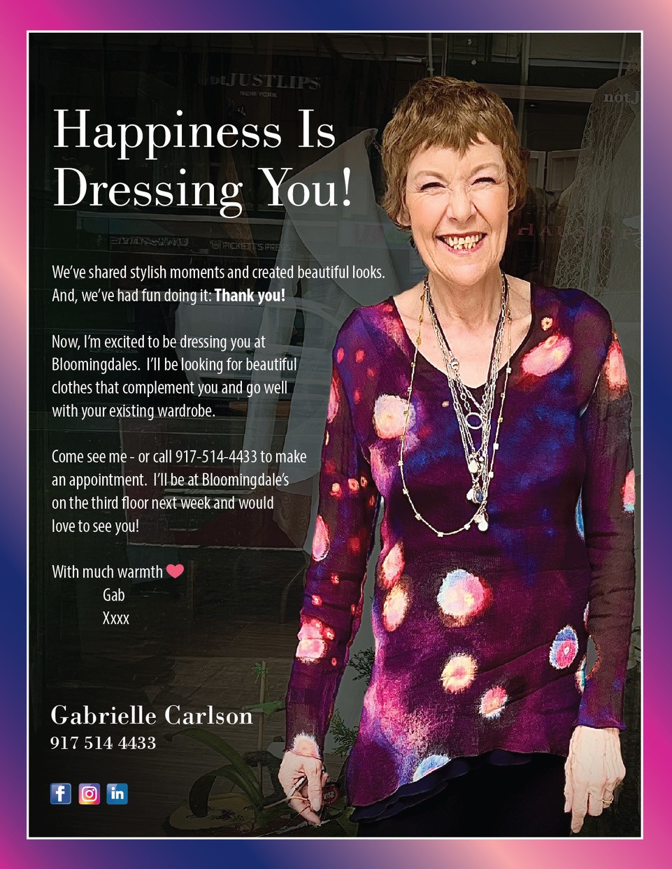 The incredible Gabrielle Carlson, celebrated designer known for dressing women of all shapes, sizes, and ages, is bringing her style expertise to Bloomingdale’s NYC flagship store! Starting this Monday, you can find her on the third floor, ready to help you find the perfect outfit for any occasion. Say goodbye to the stress of shopping—Gabrielle makes finding your ideal outfit a fun and enjoyable experience! To make an appointment with her call 917-514-4433.