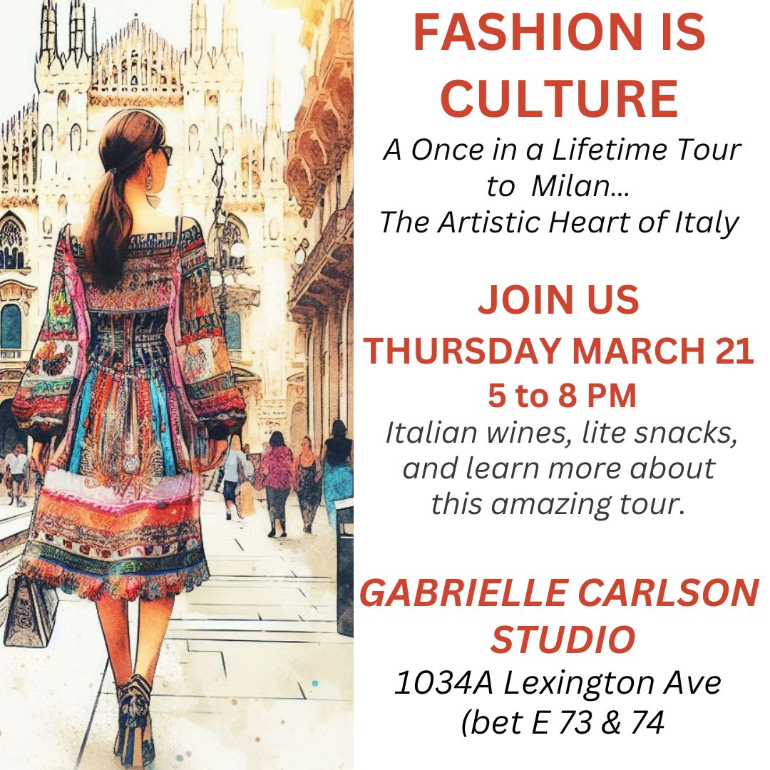 You’re invited to learn more about this once-in-a-lifetime exclusive 8-day tour into the ateliers and showrooms of Italy’s greatest couturiers and artisans. The event is hosted by Gabrielle Carlson in her beautiful boutique, where she is also having her spring sale. YOU MUST RSVP TO ATTEND THIS EVENT.