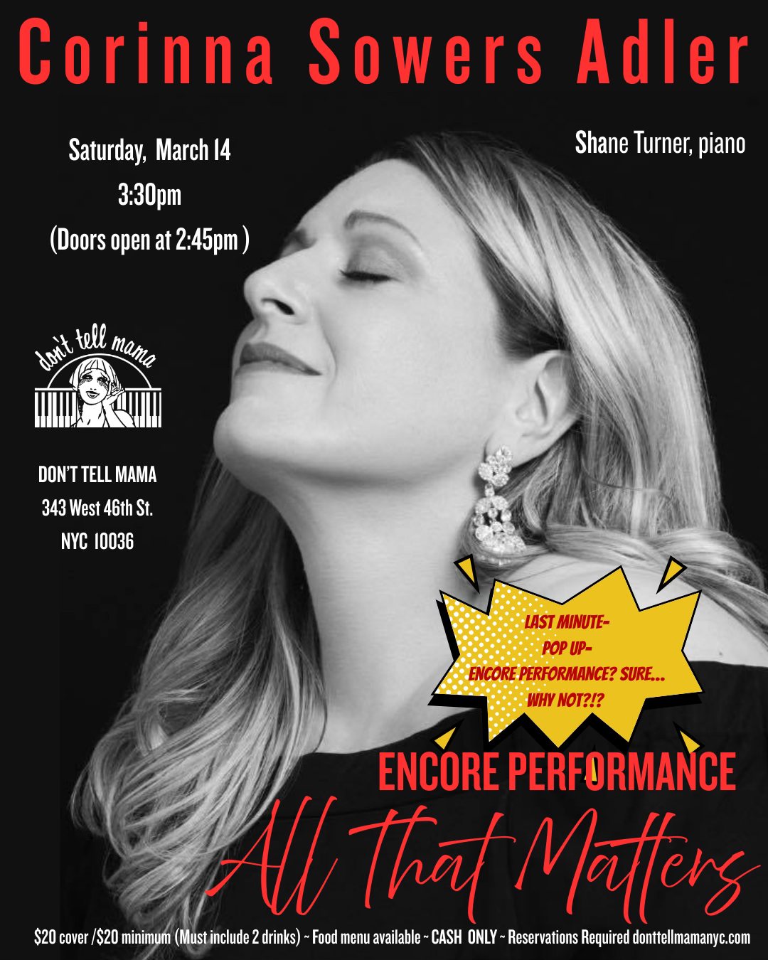 March 14@ 3:30 PM. Corinna Sowers Adler at Don’t Tell Mama.