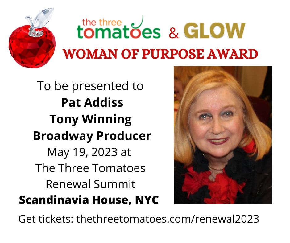 One of the highlights of this year’s Renewal Summit will be the presentation of The Woman of Purpose Award, which will be presented To Broadway producer, Pat Addis, by Cheryl Benton (The Three Tomatoes) and Anne Akers (Glow Magazine). The award recognizes inspirational role models who are not defined by age or labels but are all about living life fully at any age. A “Woman of Purpose” projects the inner and outer glow that comes from living a fully integrated life of purpose, service, and humanity. Perfectly describes Pat Addis!