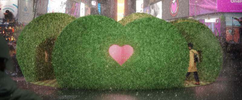 This public art installation from Times Square Arts, invites love, wonder and delight. Love’s h|Edge are intended to be fundamentally inclusive and embody the spirit of expansive compassion. The work also holds a multitude of opportunities for sensory engagement – from the scent of the roses, texture of the hedges, glow of illumination, and soft soundscape from hidden speakers, Love’s h|Edge mirrors the breadth of possibilities for sharing and experiencing love.