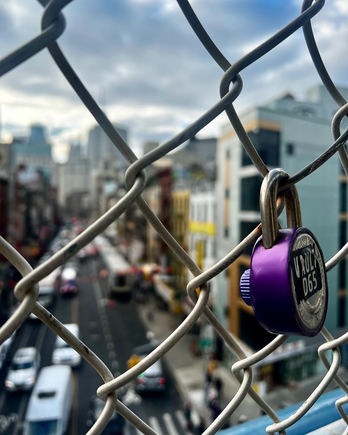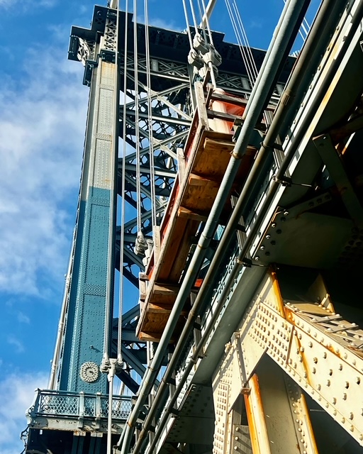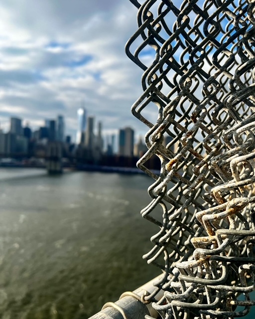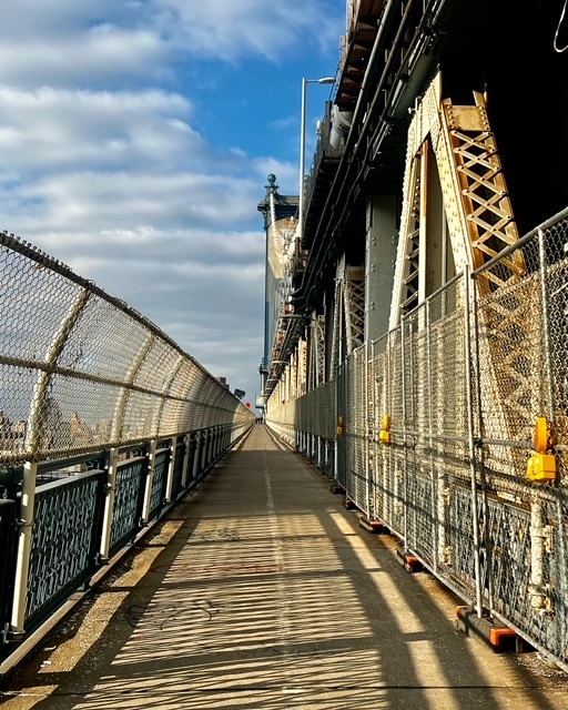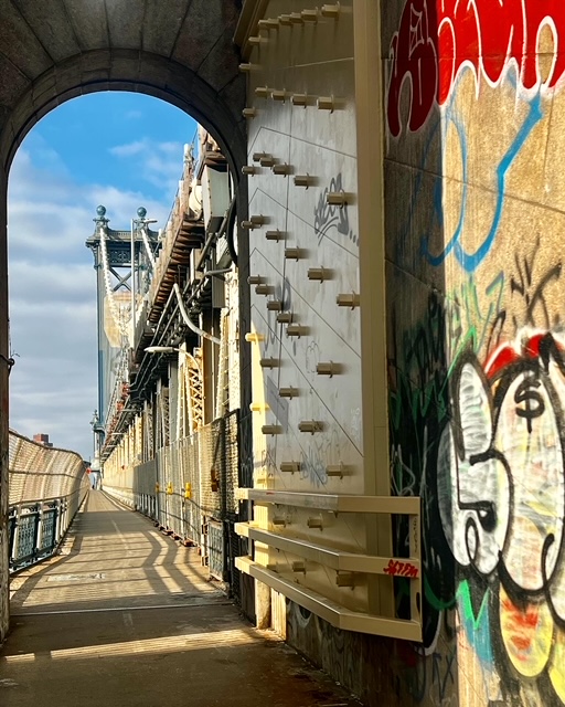I was recently in Dumbo waiting on the F train platform for far too long. I gave up and decided to make my maiden voyage walking over the Manhattan Bridge. It was a glorious sunny weekday and I had the privilege of having the pedestrian path almost to myself. I got to enjoy expansive views of Manhattan and Brooklyn, watch the light bounce and reflect on the East River, and feel the rattle beneath my feet as the subway trains sped past me.