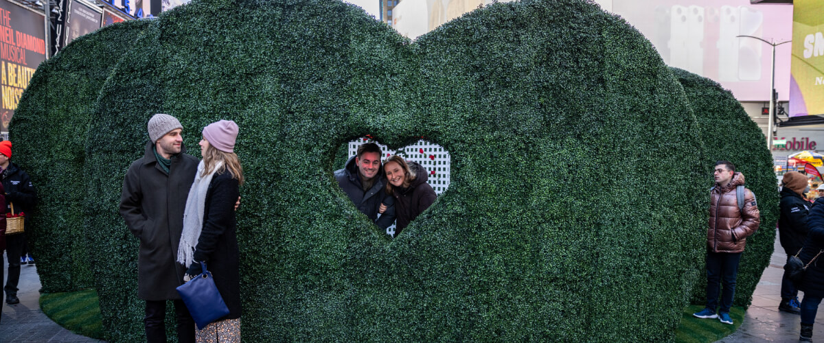 On Valentine’s Day, New Yorkers and visitors looking for love can find an abundance of romance at the Crossroads of the World. Real life love stories will unfold in form of surprise proposals, wedding ceremonies, and vow renewals – all framed by Love’s h|Edge by Almost Studio, the 15th annual Love and Design Competition winner. Each year, lovers surprise their partners with marriage proposals under Times Square’s iconic American Eagle sign; couples tie the knot on Duffy Square; and New Yorkers renew their vows on the Red Steps.
