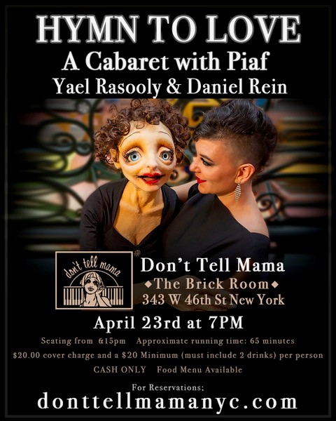 The New York Times calls International, multiple award-winning performing artist, Yael Rasooly, “Inspired wackiness.” In her new show Hymne to Love, The richly decadent worlds of the 1920s and ’30s in Paris, Berlin and New York are on dazzling display in this performance by Rasooly and Pianist, Daniel Rein. They are joined by the one and only queen of chansons, Edith Piaf, as a human-sized puppet virtuosically animated and voiced by Rasooly.